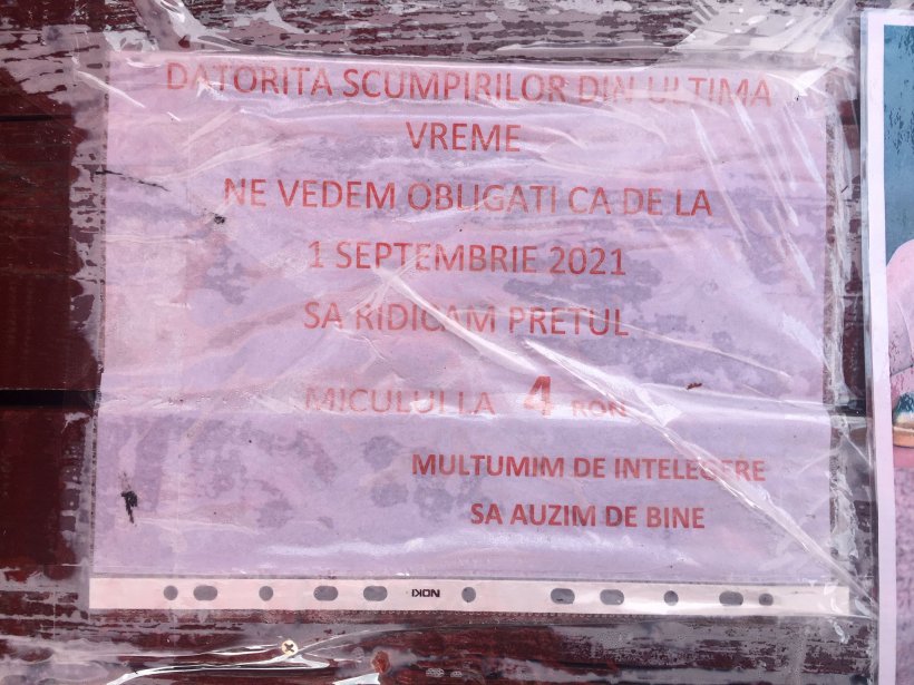 ”Datorită scumpirilor din ultima vreme ne vedem obligați ca de la 1 septembrie să ridicăm prețul micului la 4 ron. Mulțumim de înțelegere, să auzim de bine” este mesajul cu care comercianții își întâmpină clienții începând de mâine.