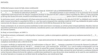 ”Susțin reclamanții că au intrat în posesia imobilului la data intervenirii convenției, au achitat prețul integral pârâtului, însă acesta refuză nejustificat perfectarea actului în formă autentică, considerent pentru care solicită instanței pronunțarea unei hotărâri judecătorești care să țină loc de contract autentic”.