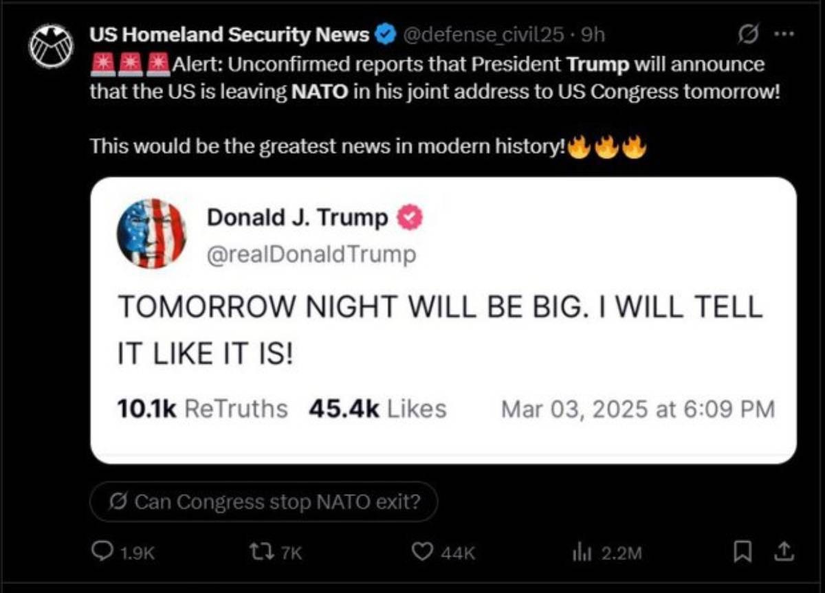 Donald Trump susține în această seară primul discurs din noul mandat în fața Congresului. Potrivit liderului, se anunță o seară importantă pentru SUA. Între timp, mai multe surse au ridicat un semnal de alarmă, susținând că Trump ar urma să anunțe, de fapt, că SUA părărsesc NATO.