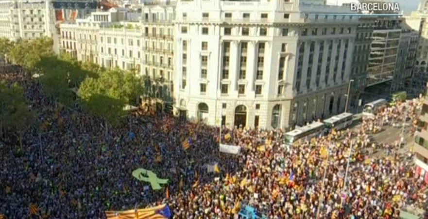Impresionanta manifestatie de strada a stans peste 450 de mii de oameni in inima Barcelonei, capitala regiunii Catalonia. Cu totii au cerut eliberarea din inchisoare a celor doi lideri separatisti acuzati de organizarea protestului din 20 septembrie.