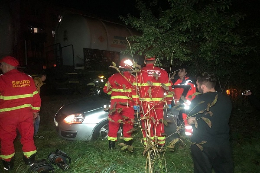 La apropierea trenului, tânărul aflat la volan a călcat acceleraţia, iar autoturismul a fost lovit în plin.