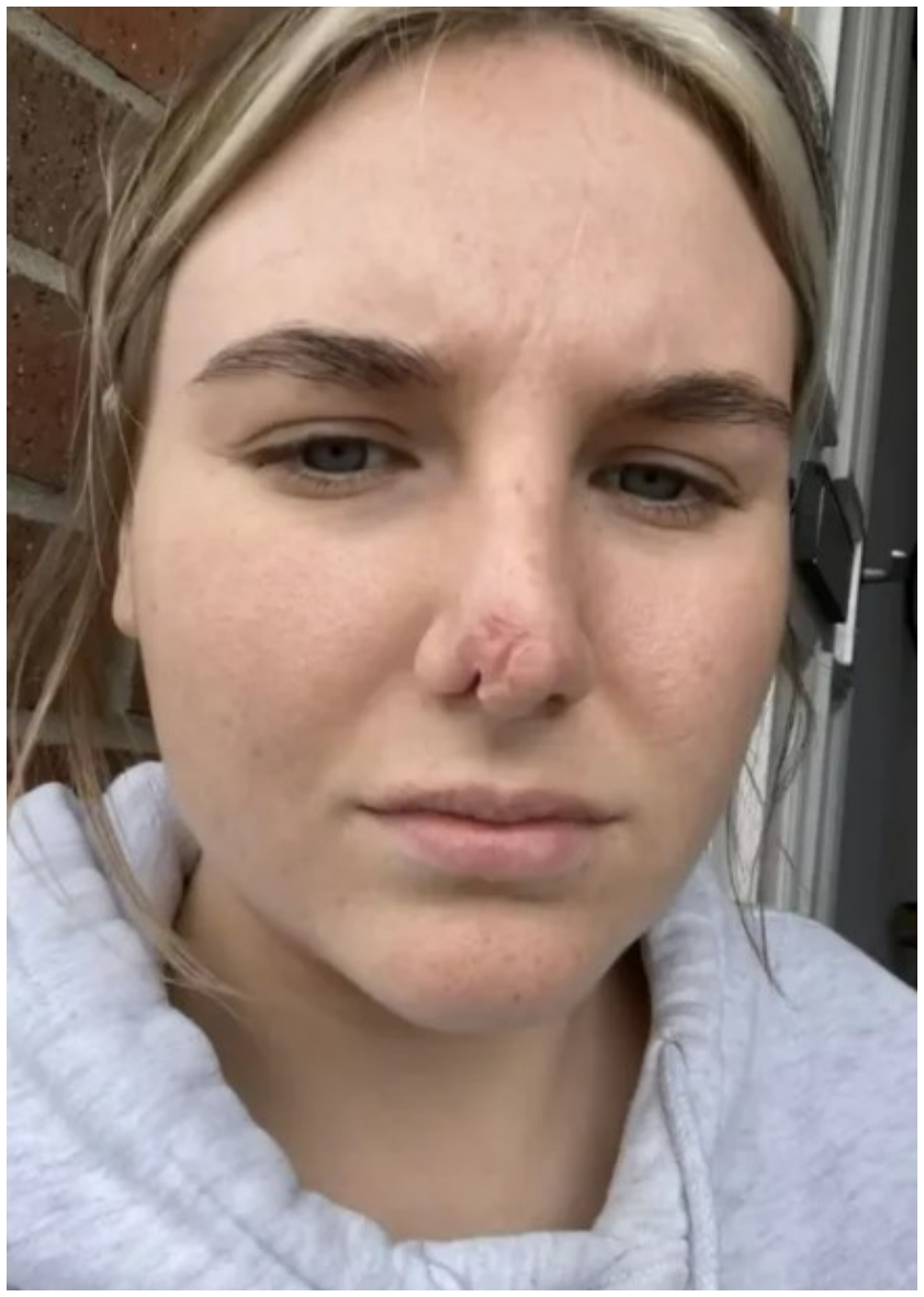 O viitoare mămică a povestit despre momentul în care i-a fost smuls nasul după ce un bulldog-cross a atacat-o când a vrut să-l mângâie. Rebecca Scobie, în vârstă de 24 de ani, lucrează ca îngrijitoare și se afla la doar câteva minute de la întâlnirea cu un nou pacient la domiciliu când s-a petrecut incidentul groaznic.