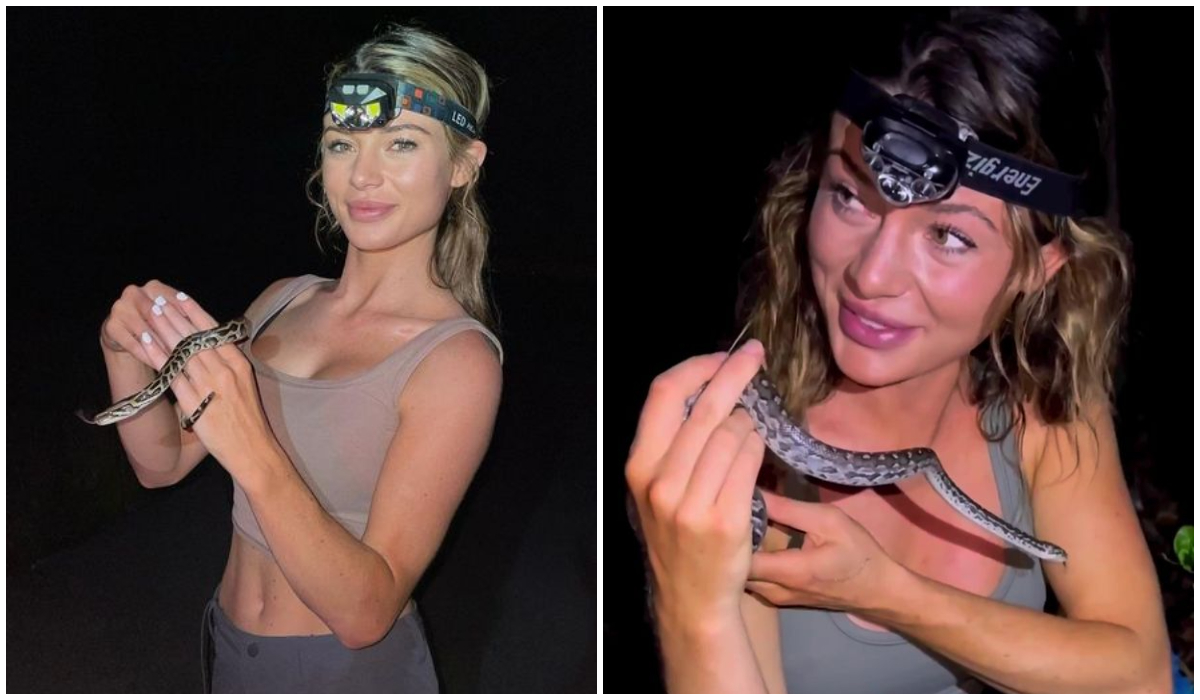 În imaginile de mai jos, se vede cum "cel mai sexy biolog din lume" prinde un mic șarpe Bimini Boa și tânărul animal a secretat mosc pe mâna ei, o substanță menită să alunge prădătorii.