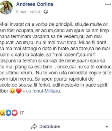 Atunci, la câteva zile după tragedie, Andreea a scris un mesaj cutremurător pe pagina de Facebook a lui Ionuţ, în care îşi exprima regretul pentru moartea prematură a prietenului ei.