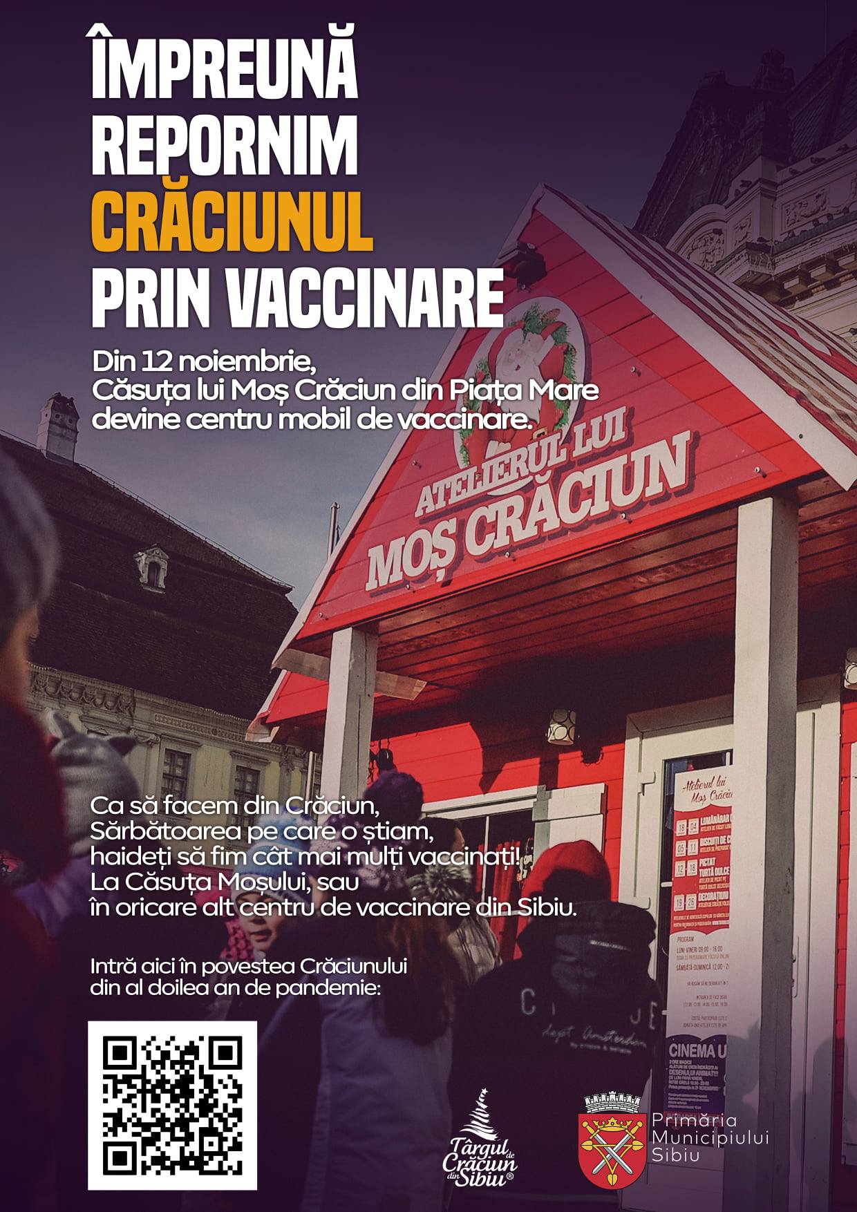 Căsuța lui Moș Crăciun din Piața Mare din Sibiu a fost transformată zilele acestea în centru de vaccinare. Aici au fost amplasate două cabine unde doritorii pot alege să primeasca serul de la Pfizer sau Johnson. O echipă de medici și asistente întâmpină doritorii într-un decor special de sărbători.