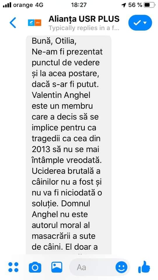 ”Valentin Anghel este un membru care a decis să se implice pentru ca tragedii ca aceea din 2013 să nu se mai întâmple vreodată. Uciderea brutală a câinilor nu a fost și nu va fi niciodată o soluție. Domnul Anghel nu este autorul moral al masacrării a sute de câini. El doar a cerut autorităților să rezolve problema și politicienii așa au înțeles să rezolve o problemă veche de peste 20 de ani. Ucigând”, se arată într-un mesaj postat pe pagina de Facebook a USR-Plus.