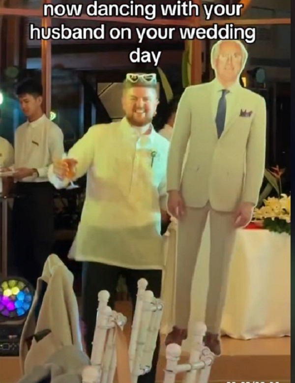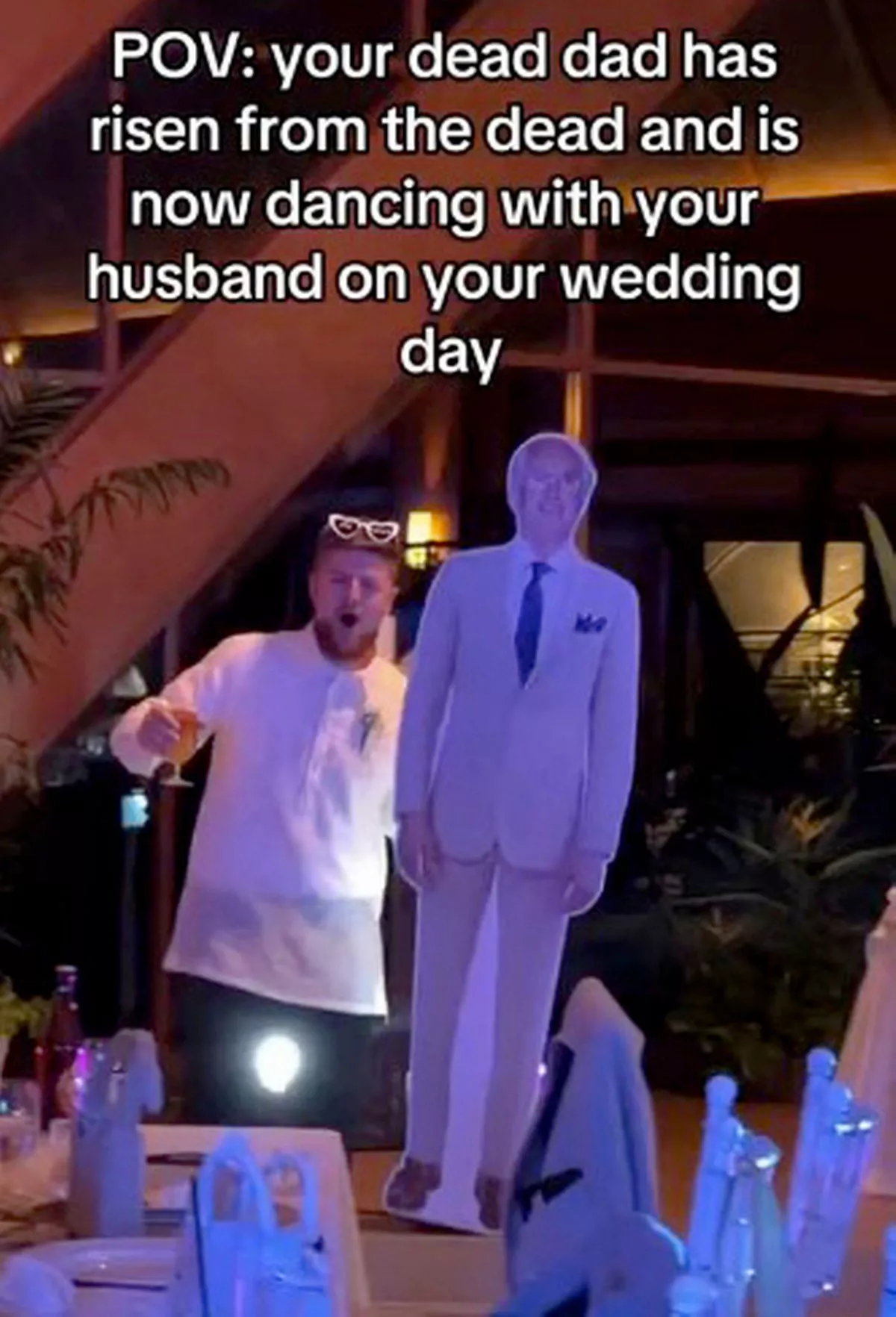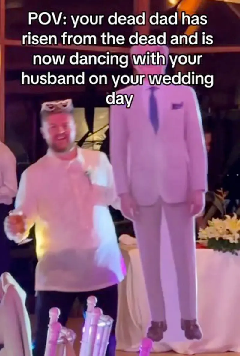 @skimcareee Imagine walking down the aisle and seeing a cut out of your dead dad waiting for you 😭😂 my husband ladies and gents xxxx (fab idea for any late parents) #deaddadclub #2023bride #filipinotiktok #filipina #deaddadjokes #darkhumour #weddingtiktok ♬ original sound- skimcareee