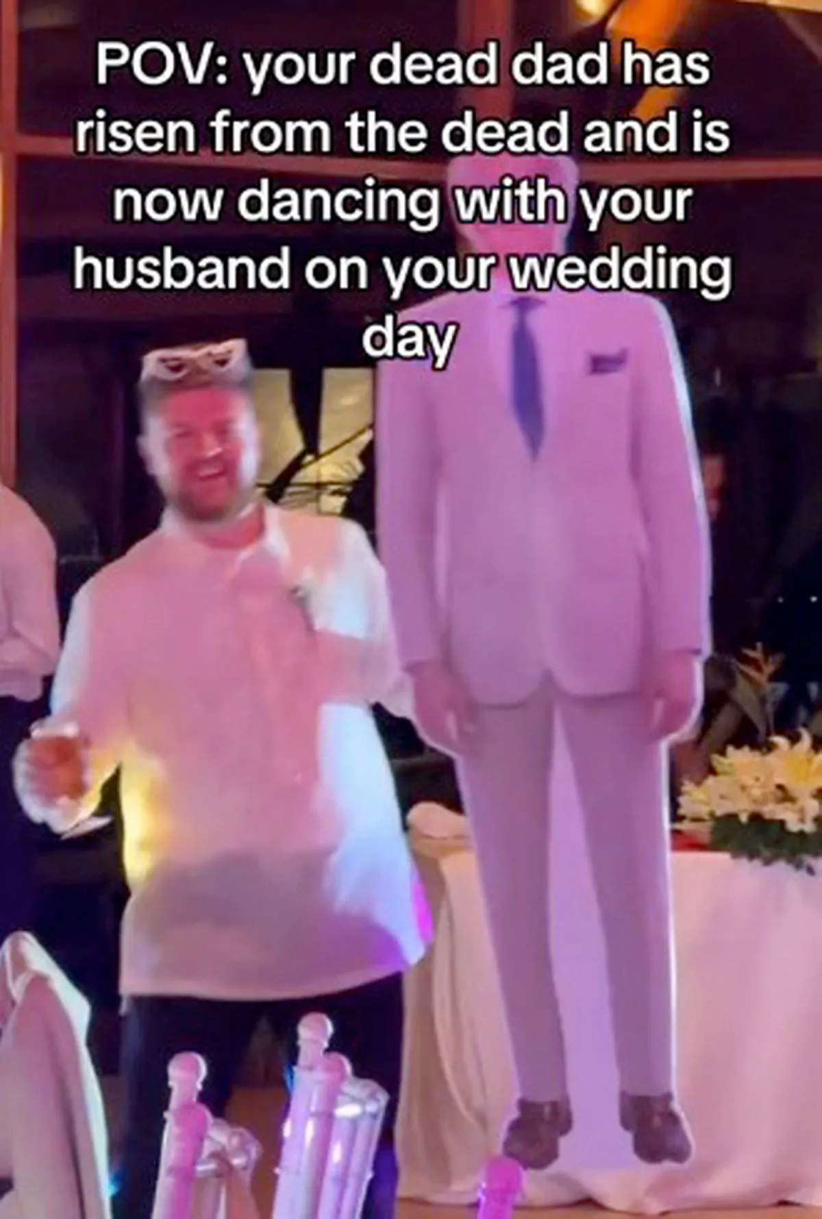 În partea de sus a clipului, mireasa a scris: „POV: Tatăl tău mort a înviat din morți și acum dansează cu soțul tău în ziua nunții tale”.