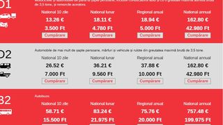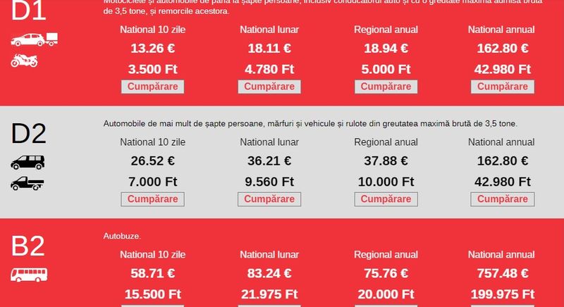 Vigneta de tip D2- pentru automobile de mai mult de șapte persoane, mărfuri și vehicule și rulote din greutatea maximă brută de 3,5 tone. Costul este de 7000 de forinți( 26,5 euro) pentru 10 zile și 9560 forinți pe o lună întreagă (37 euro) .