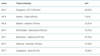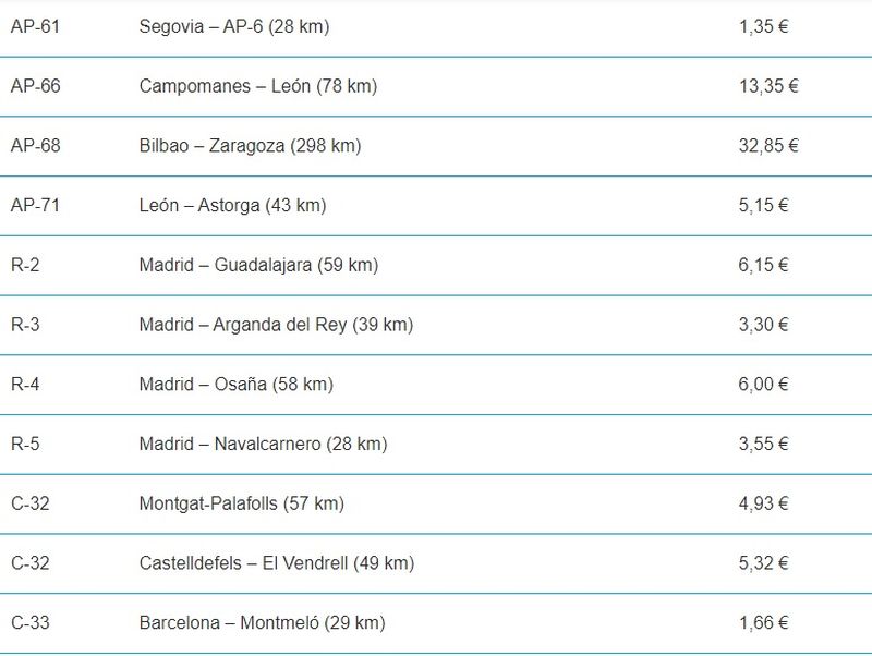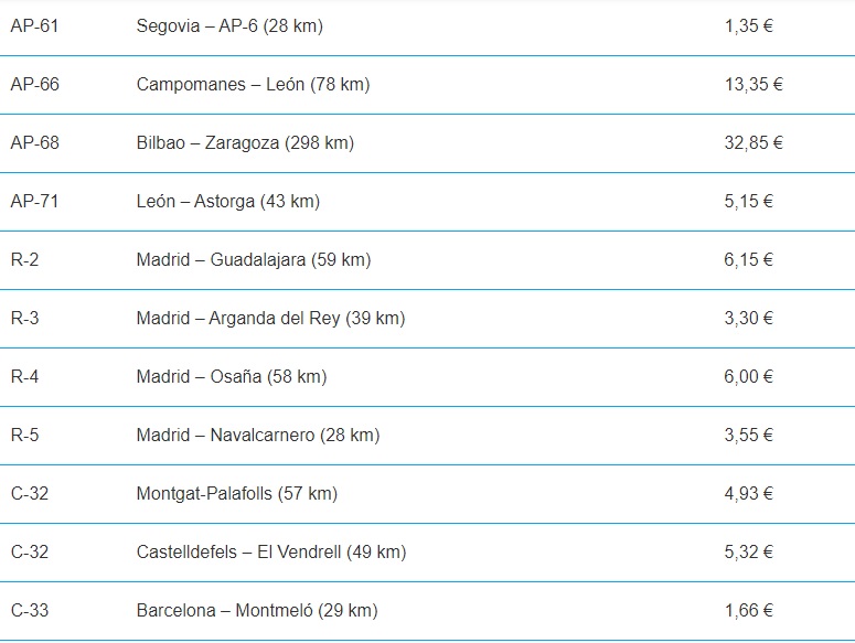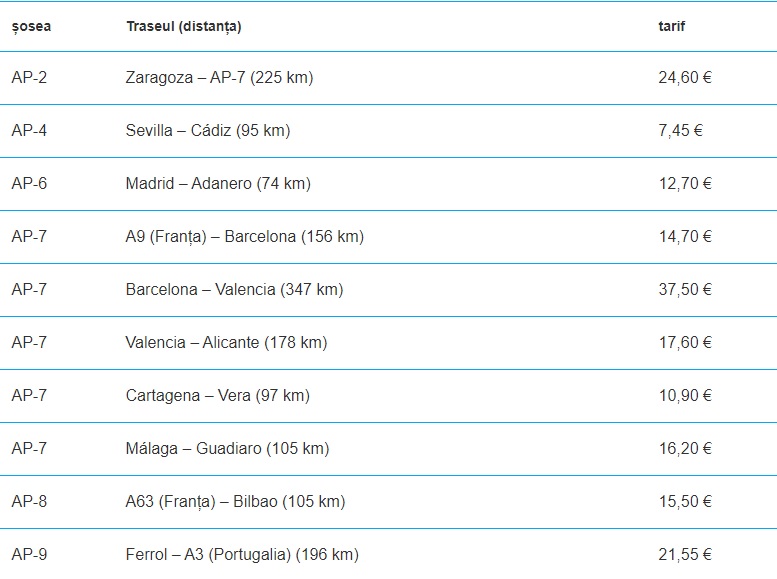 Taxa de drum în Spania se face în funcție de distanța parcursă, categoria vehiculului, anotimp și interval orar. La ore de vârf, tarifele cresc: