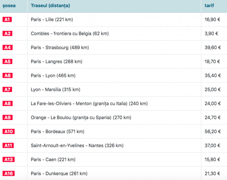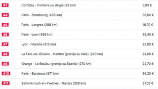 În Franța, se percepe o taxa pentru utilizarea drumurilor în funcție de categoria vehiculului și de distanță parcursă. Printre cele mai mici tarife sunt 4 euro pentru 60 km sau 11 euro pentru 180 km.
