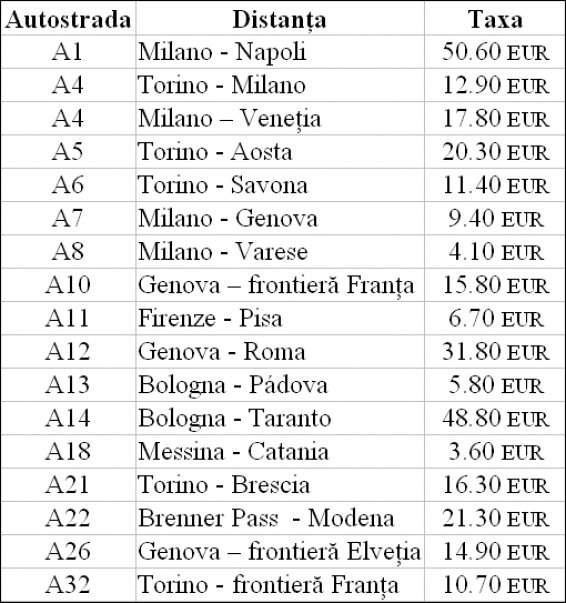 Taxa fixa. În sistemul cu taxare fixă, taxarea nu mai depinde de kilometrii parcurşi, ci se plăteşte o suma fixă în funcţie de clasa autovehiculului. Acest sistem de taxare, mai putin raspandit, se aplica pe Autostrada dei Laghi, pe ocolirile din jurul orasului Milano (A50, A51 si A52), pe inelul Nord şi Sud al oraşului Milano, pe secţiunea A3 a