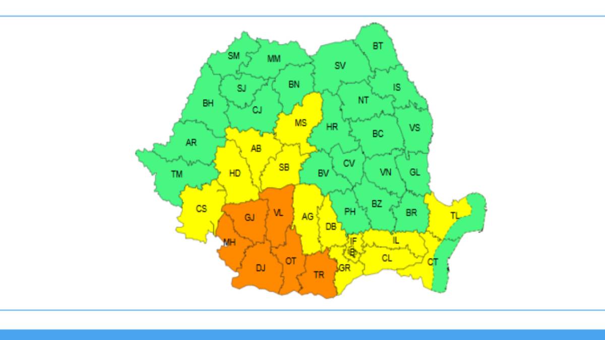 În acelaşi interval este valabilă şi o avertizare cod portocaliu de caniculă şi disconfort termic ridicat, în cea mai mare parte a Munteniei, local în Transilvania, în sudul Banatului şi în Dobrogea continentală.