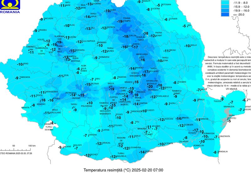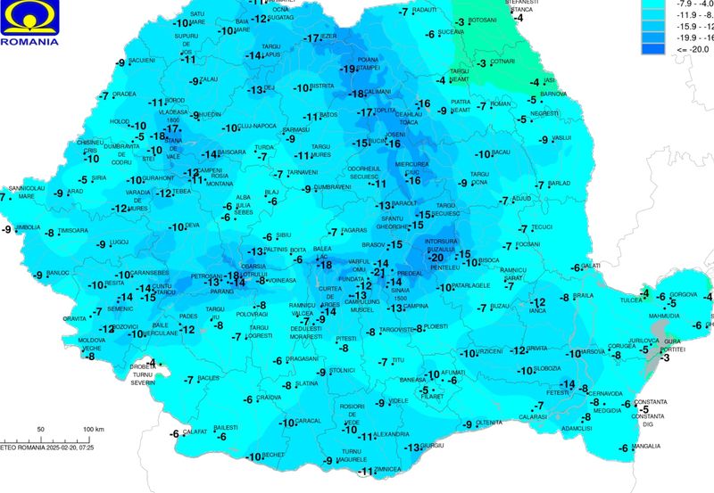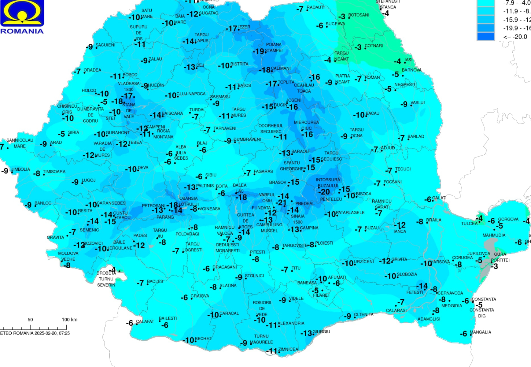 La ora 7 dimineața, potrivit datelor ANM, erau minus 20 de grade la Întorsura Buzăului, iar minus 19 grade la Poiana Stampei.