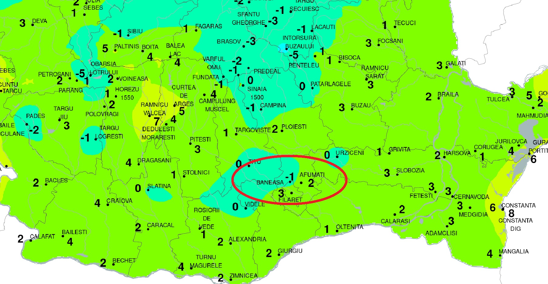 În dimineața zilei de vineri, 18 octombrie, la stația meteo Băneasa s-au înregistrat minus 1 grad Celsius, iar temperatura resimțită a fost de minus 2 grade, din cauza vântului rece.