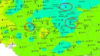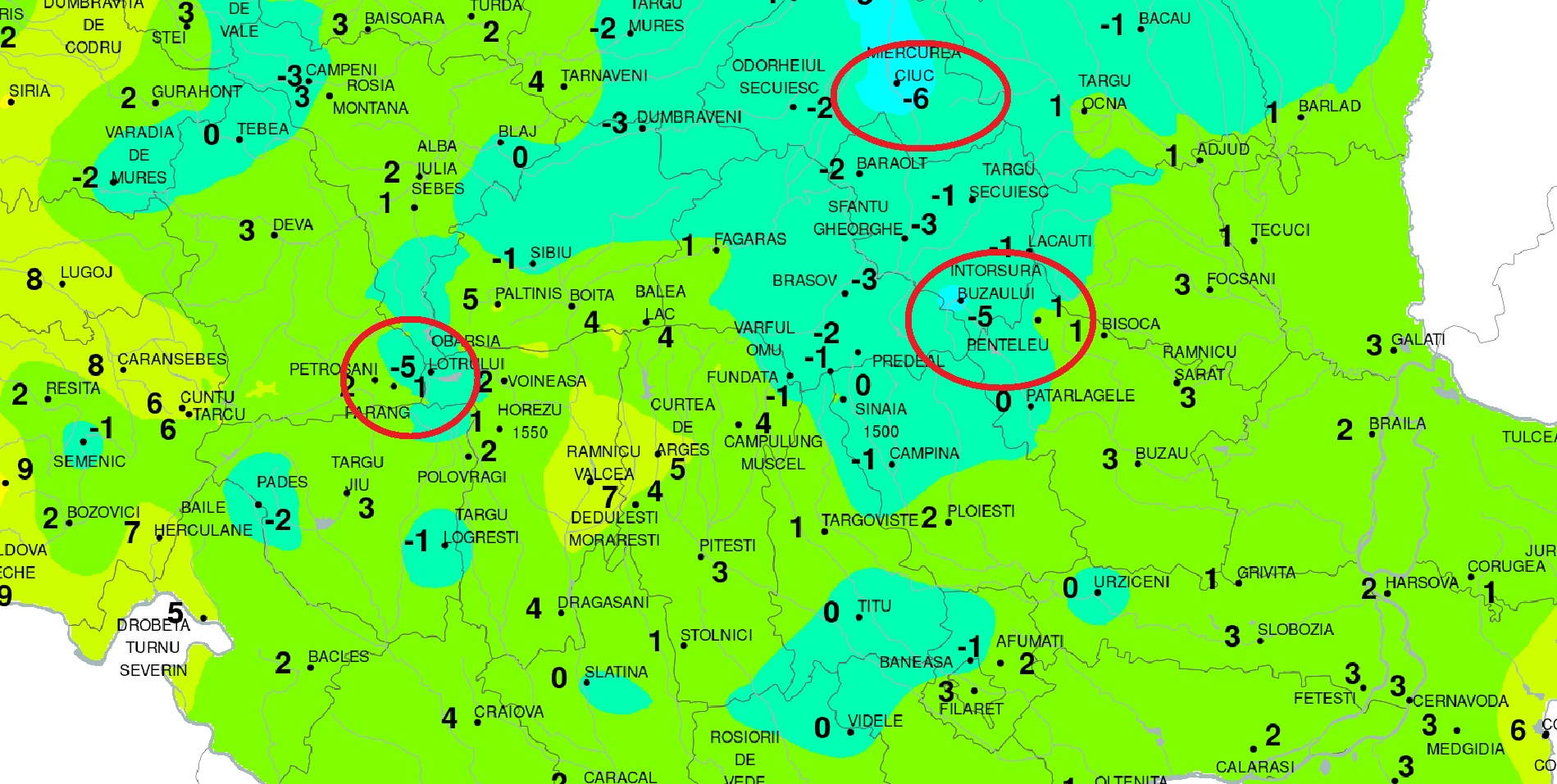 La Topliţa au fost minus 5,3 grade Celsius, la Joseni s-au înregistrat minus 4,9 grade, în vreme ce la Odorheiu Secuiesc s-a consemnat o valoare de minus 1,8 grade Celsius.