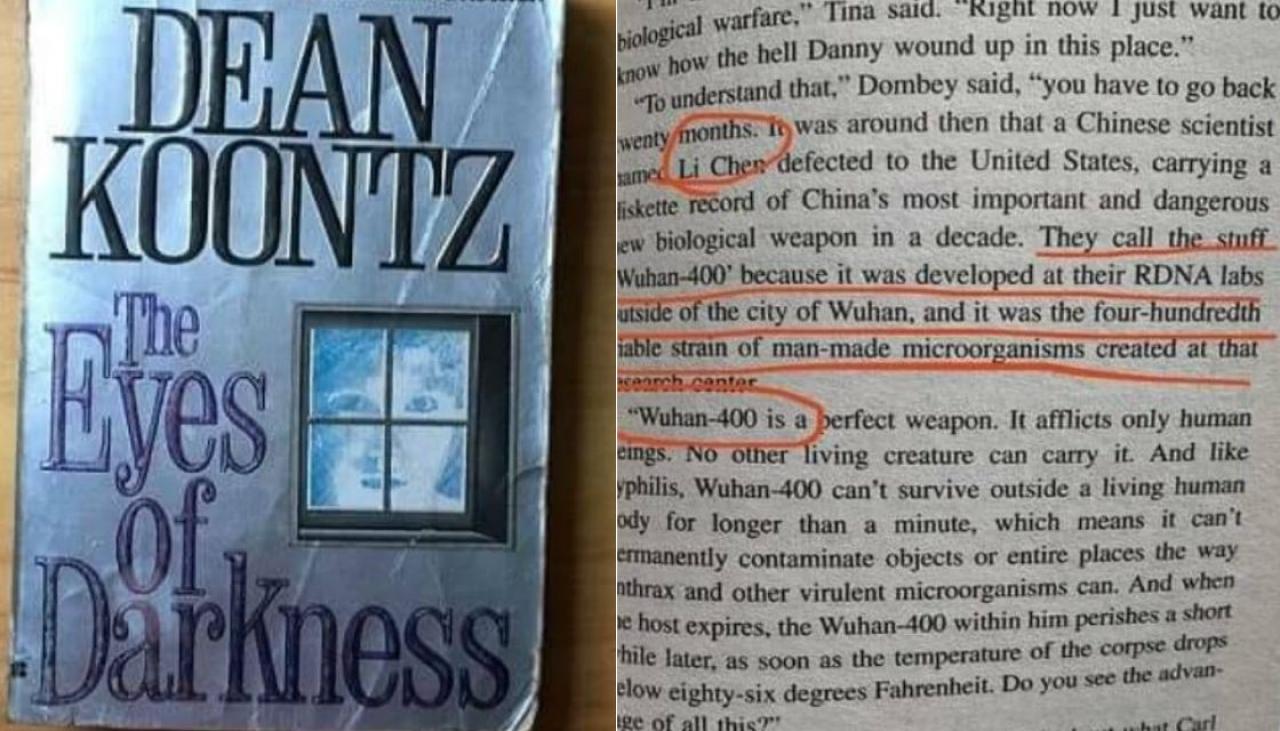 Isteria iscată de răspândirea coronaviruslui în întreaga lume a dat prilejul adepților teoriei conspirației să lanseze tot felul de ipoteze legate de apariția acestuia. În ultimele zile, în mediul online circulă o un citat din cartea ”The Eyes of Darkness” (Ochii întunericului), scrisă în 1981 de celebrul autor Dean Koontz, în care se vorbește despre o armă bilogică numită ”Wuhan-400”, scăpată dintr-un laborator din China.