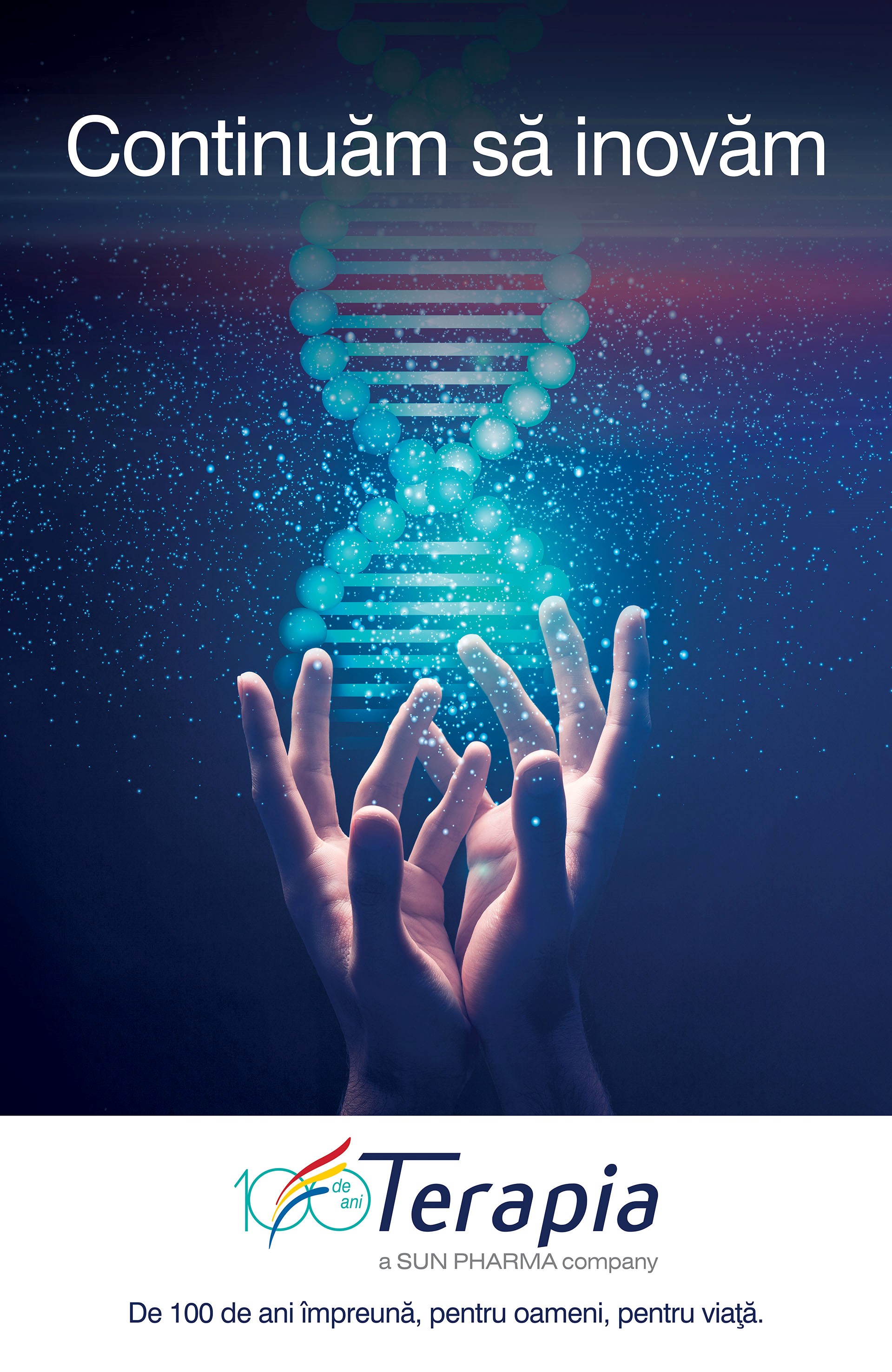 Terapia - o companie SUN PHARMA, cel mai mare producător de medicamente din România, anunță lansarea unei ample campanii aniversare, denumită simbolic „De 100 de ani împreună pentru oameni, pentru viață”, prin care marchează celebrarea a 100 de ani de prezenţă neîntreruptă pe piața farmaceutică locală. Campania care se va desfășura în mediile TV, radio, print și online vine să reconfirme continuitatea și angajamentul companiei Terapia de a aduce știința, tehnologia și inovația aproape de oameni, pentru o viață mai bună.