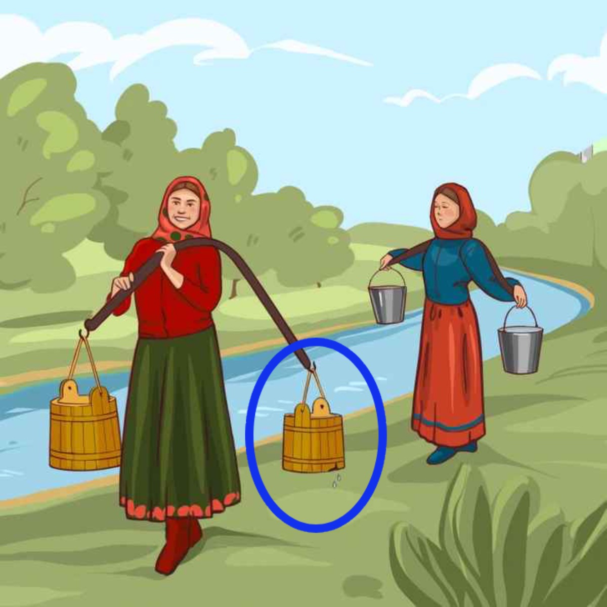 În urma unei atenții sporite, o să observi cum prima femeie are vasul spart. Picături de apă cad din vas în timp ce ea merge. Prin urmare, aceasta va ajunge la destinație cu mai puțină apă.