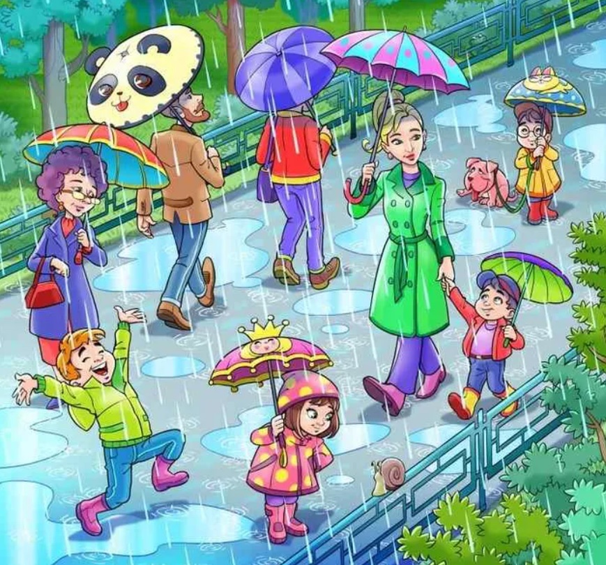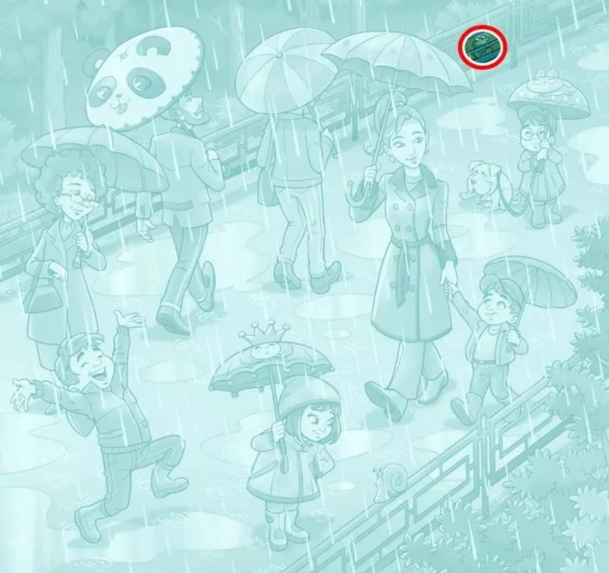 Imaginea de mai sus reprezintă un test bun atât pentru adulți, cât și pentru copii. Desenul ilustrează o zi ploioasă, în care mai multe persoane au ieșit la plimbare. Chiar dacă în imagine se văd cu ușurință mai multe animale, precum un melc și un câine, pentru a rezolva acest test de atenție trebuie să găsești broasca.