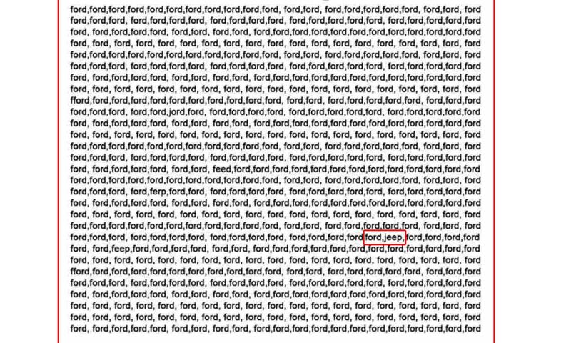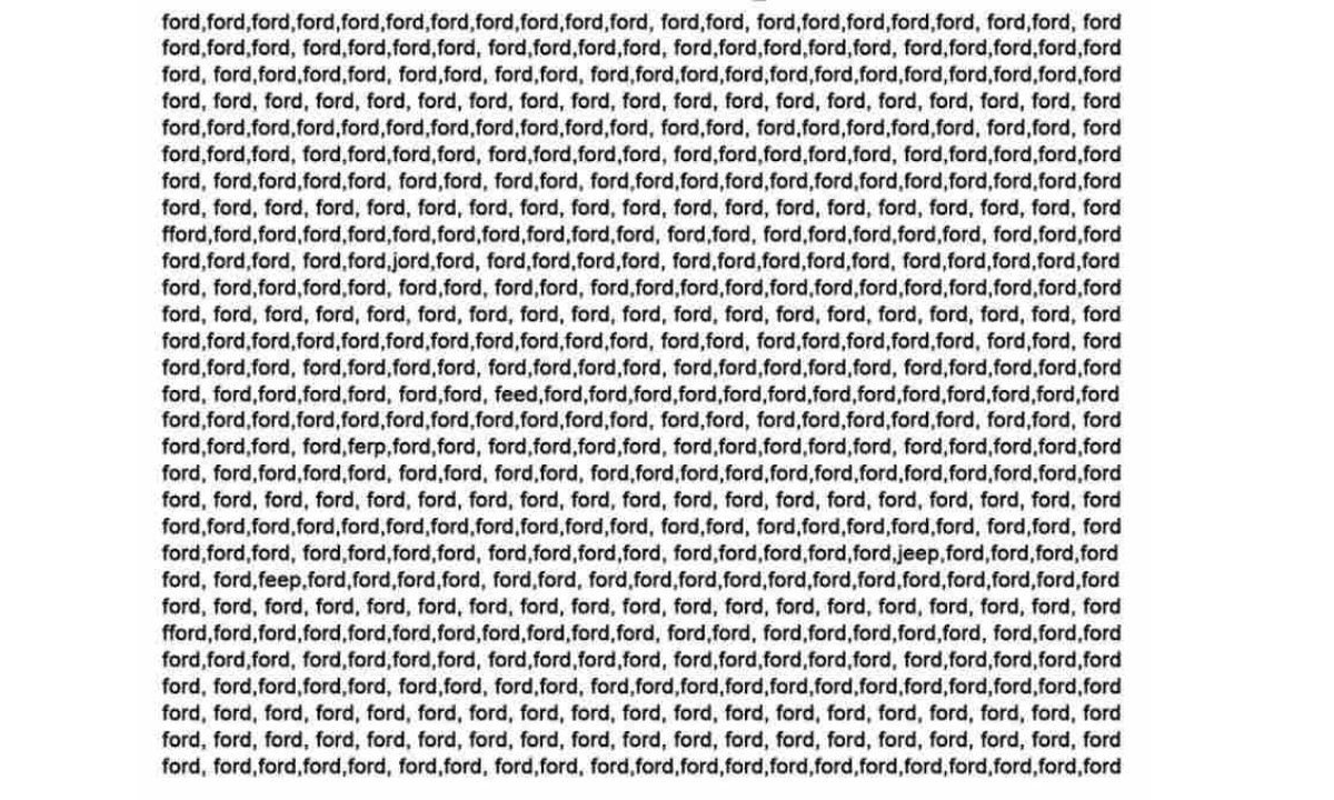 Testul IQ de azi îți va pune la încercare concentrarea și atenția la detalii. Din cele aproape 600 de cuvinte, tu va trebui să descoperi unul simplu: jeep! Doar cei mai agili ochi vor reuși să-l depisteze în mai puțin de 8 secunde. Pune-ți ochelarii (dacă e cazul), pornește cronometrul și start! Ford, ford, ford, ford, ford... De sute de ori ford. Dar unde este jeep-ul?