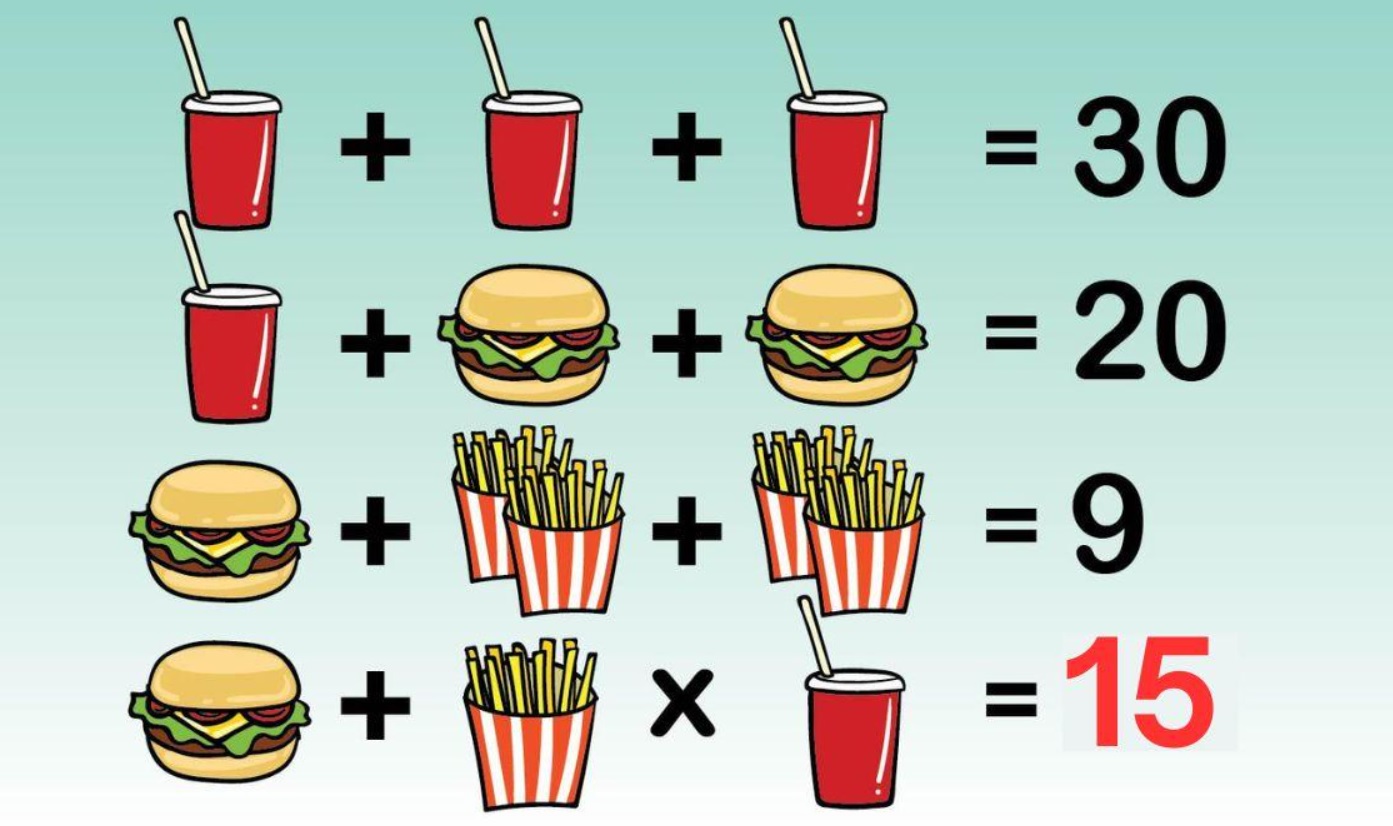 Acum știm că un suc este egal cu 10, un burger= 5 și un pachet de cartofi prăjiți= 1. Acum, pentru ecuația finală, se înlocuiesc toate valorile.