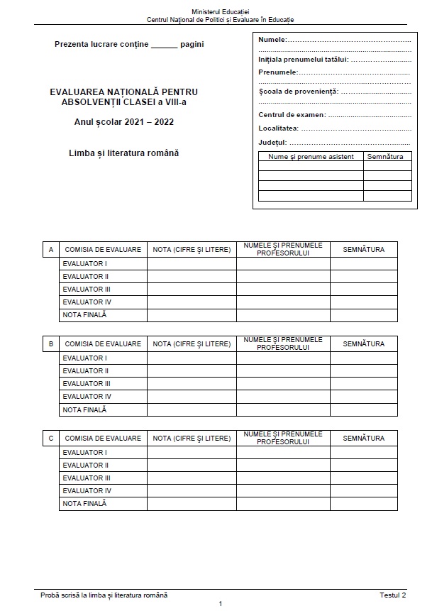 2 din 9 | Modele de subiecte Evaluarea Națională 2022- Limba Română.