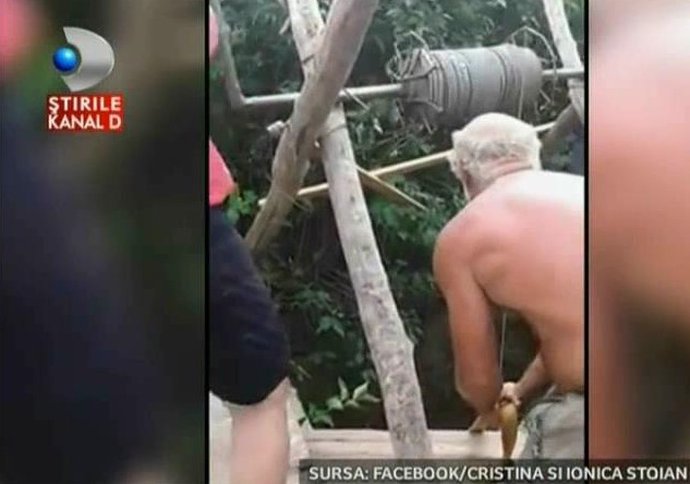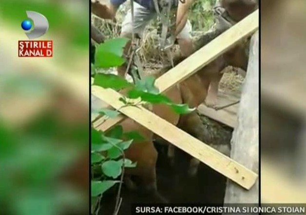Barbatii n-au stat pe ganduri si au injghebat pe loc un fel de scripete, pentru a putea sa ajunga la bietul animal. Au luat mai multe barne, pe care le-au transformat in stalpi de sustinere si au folosit si roata de la fantana.