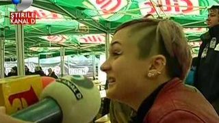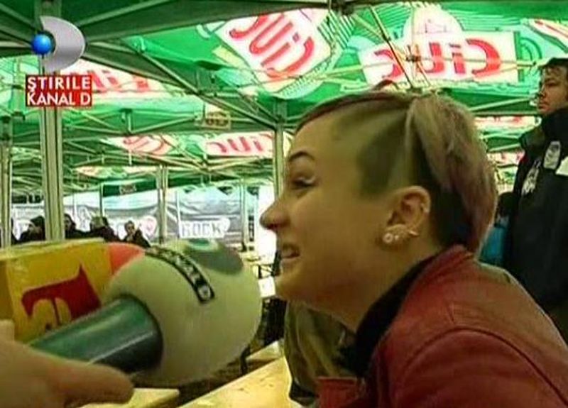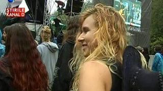 Domnisoara din imagine pare sa reziste la temperaturi scazute si la stropii de ploaie care cad non stop. Cu parul ud, dar fericita...se bucura de concertul rock: „Cum e la concert? E foarte fain, cum sa fie? Nu ti-e frig? Nu, ca am asta (palaria- n.r) de ploaie!".