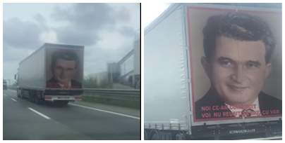 Imaginile în care TIR-ul cu numere de Suceava și cu chipul lui Nicolae Ceaușescu pe prelată, cu un mesaj pentru toți românii, au făcut înconjurul internetului.