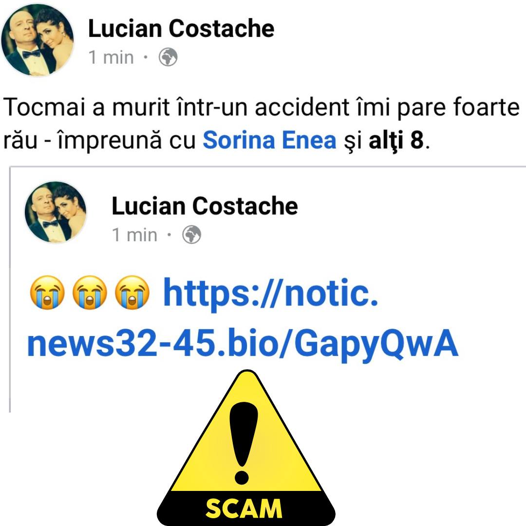 "Un astfel de caz a fost prezentat săptămâna trecută de către CyberM.ro: atacatorii se foloseau de conturi compromise pentru a lansa mesaje false cu un caracter tragic, în care anunțau moartea anumitor persoane în urma unor accidente. Ținta principala a atacatorilor era, evident, stârnirea curiozității sau panicarea utilizatorilor pentru a face click pe link, cu scopul de a afla mai multe detalii.