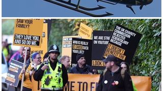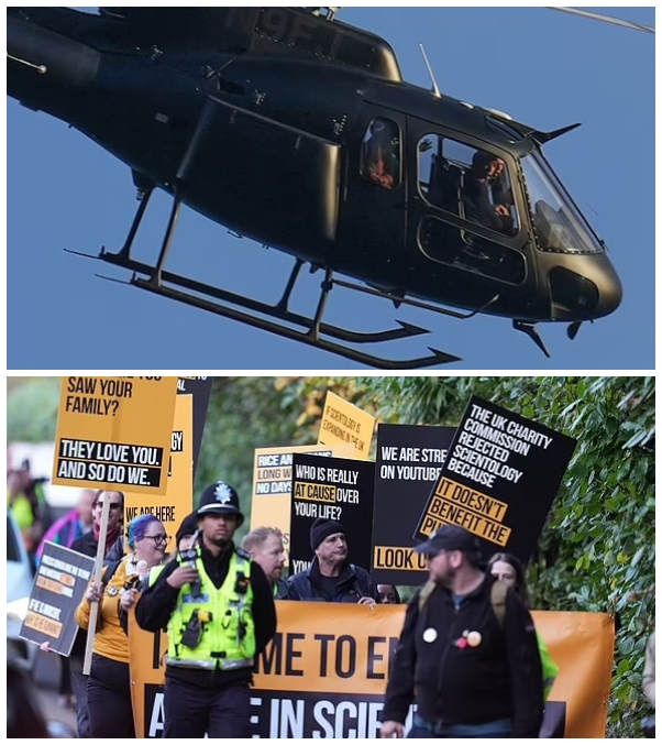 Tom Cruise a fost fotografiat, vineri 3 noiembrie, părăsind sediul Scientology cu elicopterul, în timp ce protestatarii au fost fotografiați ținând numeroase pancarte în afara sediului central al sectei din Marea Britanie.