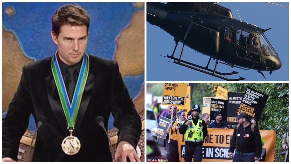 Celebrul actor american Tom Cruise a fost văzut zburând din sediul central al Bisericii Scientologice cu un elicopter în timp ce foștii membri protestau împotriva religiei controversate.