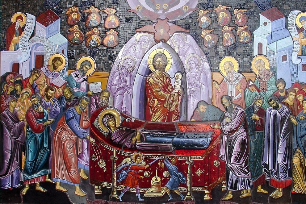 Sfanta Maria a fost instiintata printr-un inger de trecerea ei la cele vesnice, iar apostolii, fiind aflati in diferite zone ale lumii, au fost adusi pe nori pentru a fi prezenti la acest eveniment.