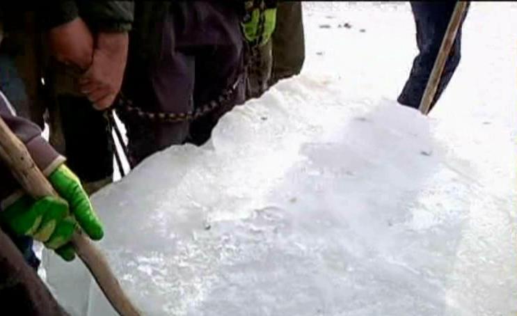 Dupa ce s-au chinuit minute in sir, pe un ger naprasnic, truda satenilor de a decupa bucati imense de gheata, a fost rasplatita pe masura.
