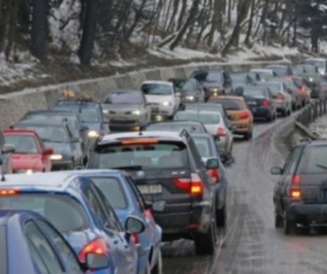 La această oră, pe Valea Prahovei se circulă în coloană, de la limita cu judeţul Braşov, în zona staţiunilor Predeal, Azuga, Buşteni, Sinaia, până în oraşul Comarnic, pe tronsonul kilometric 104-107.
