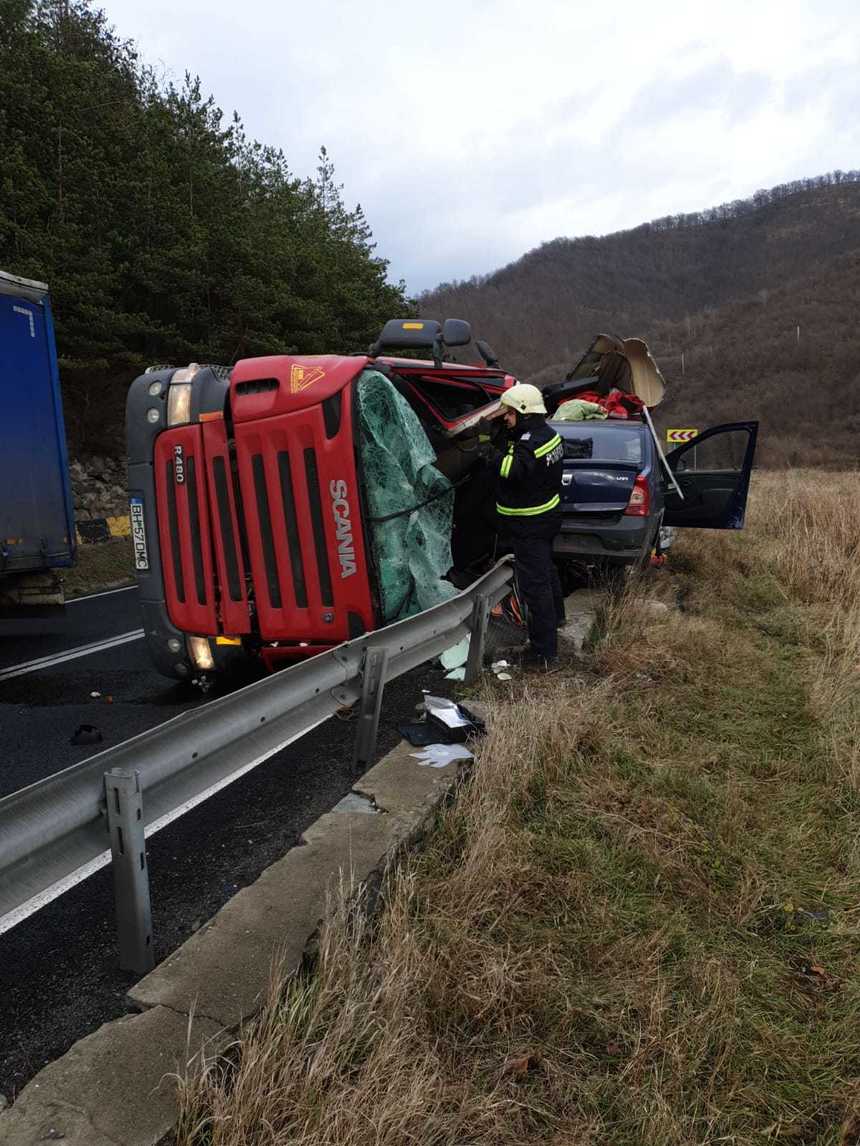 Traficul rutier pe Drumul Naţional 7 este blocat, vineri, între localităţile Boiţa şi Lazaret, judeţul Sibiu, după ce un TIR s-a răsturnat peste au autoturism. O persoană a murit şi două sunt rănite.