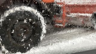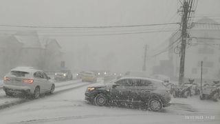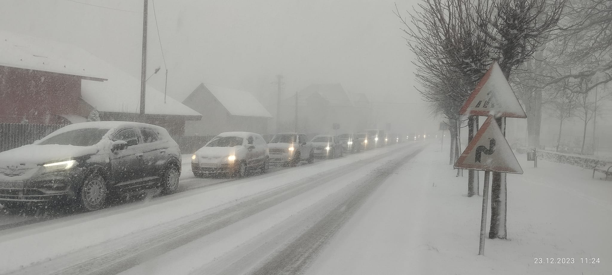 Ninge viscolit, iar carosabilul este acoperit cu zăpadă, astfel încât șoferii sunt avertizați să conducă prudent în aceste condiții și să folosească frâna de motor.