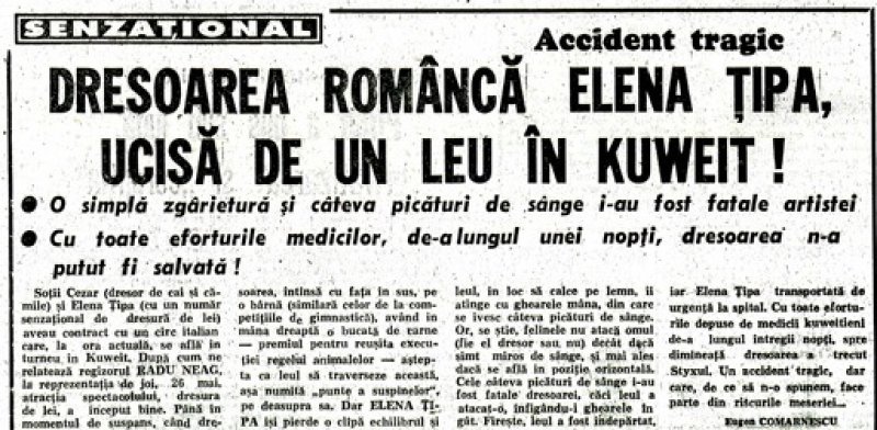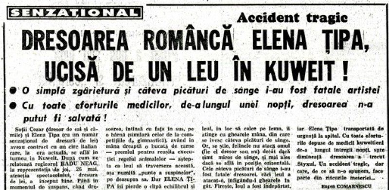 Drama Elenei Tipa, o dresoare romanca de lei, a fost una care a socat la momentul respectiv lumea circului, dar si lumea intreaga. Ea si-a pierdut viata in 1994 intr-un accident groaznic la circ.