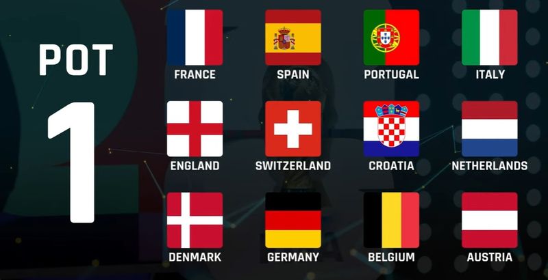 Urna 1: Franța* (sau Croația), Spania* (sau Țările de Jos), Anglia, Portugalia* (sau Danemarca), Țările de Jos* (sau Spania), Belgia**, Italia* (sau Germania), Germania* (sau Italia), Croația* (sau Franța), Elveția, Danemarca* (sau Portugalia), Austria**