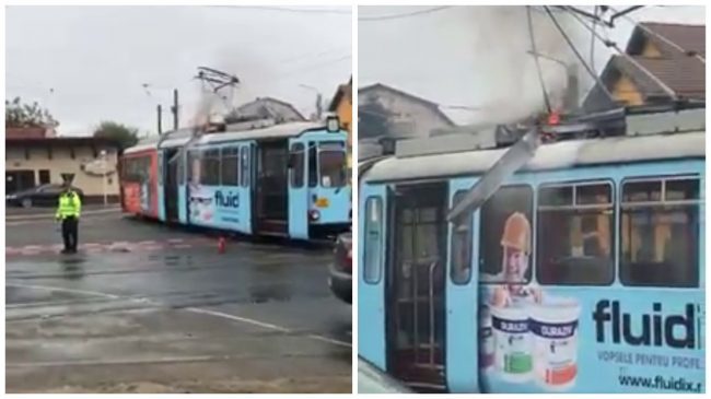 Un tramvai a fost cuprins de flăcări în zona Piaţa Obor din municipiul Arad