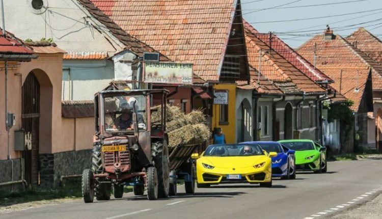 Fotografia a fost realizata in satul Cartisoara, din judetul Sibiu. Cele trei masini de lux au filmat o reclama pe Transfagarasan, iar la coborare, soferii au fost nevoiti sa astepte dupa un tractor.
