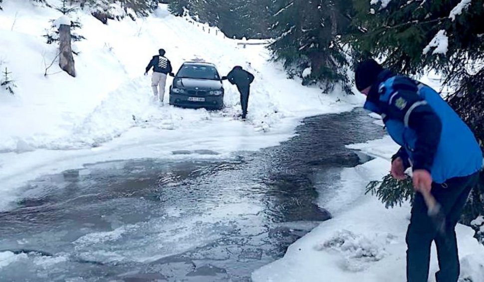 Conform Jandarmeriei, trei turiști din județul Arad, cazați în Arieșeni, s-au aventurat cu BMW-ul echipat necorespunzător pe Valea Cobleș din localitatea Arieșeni, rămânând ulterior blocați în zăpadă, pe un râu înghețat.