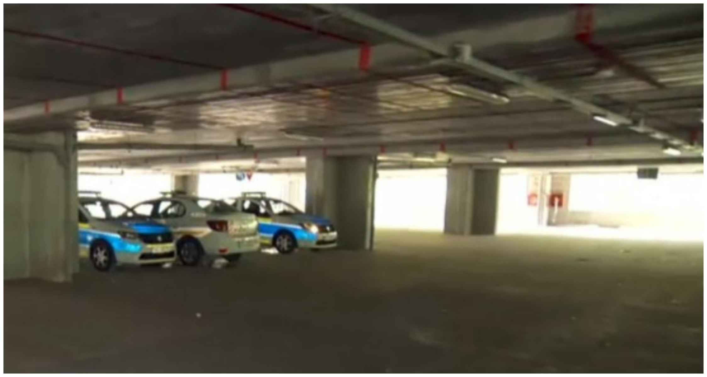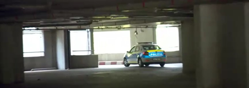 Echipa Digi 24 a povestit că după ce a intrat în parcarea pustie, la etajul al doilea, a găsit, întâmplător, trei mașini de poliție una lângă alta.