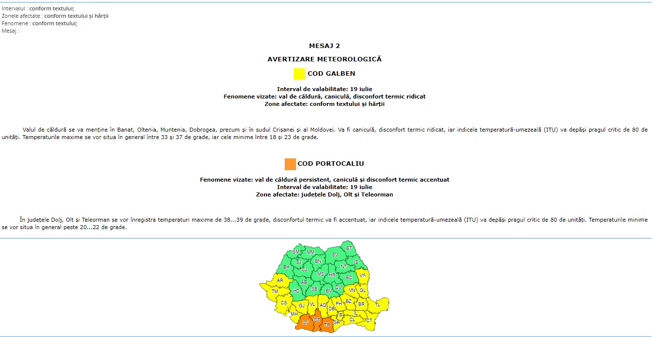 În al doilea mesaj este prevăzut și valul de căldură, caniculă, disconfort termic accentuat. Codul galben rămâne valabil pentru jumătatea sudică a țării și cod portocaliu pentru tei județe din partea de sud-vest a României.