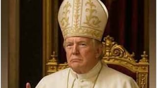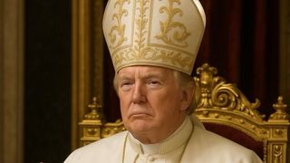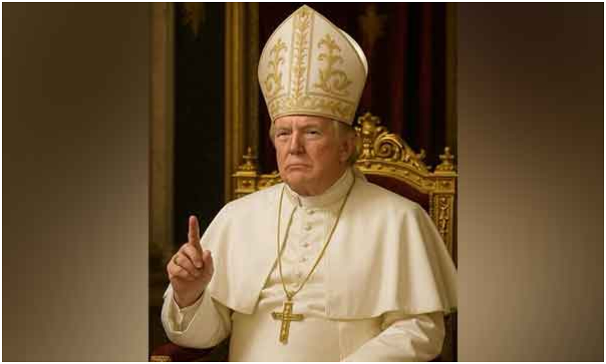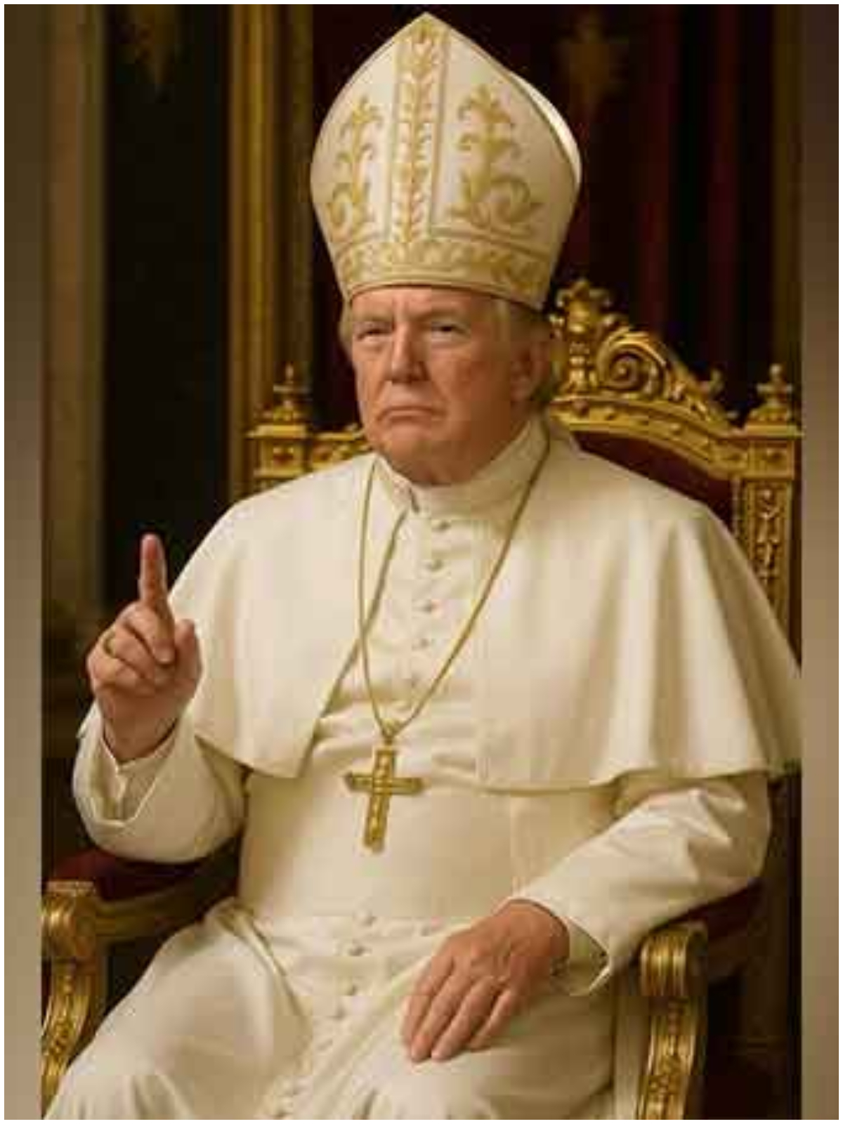 Fotografia color difuzată pe Truth Social îl arată pe preşedintele american aşezat într-un fotoliu, cu un aer solemn, cu faţa închisă, îmbrăcat în alb, purtând mitra, având la gât impunătoarea cruce de aur, cu mâna stângă sprijinită pe coapsă şi cu degetul arătător drept ridicat spre cer.