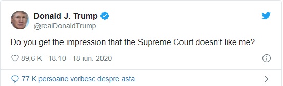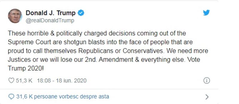 Prin hotărârea cu privire la drepturile salariaţilor gay şi transgen şi la statutul a sute de mii de tineri imigranţi, ”templul” dreptului american ”scuipă în faţă oameni mândri să se considere republicani sau conservatori”, a scris Trump pe Twitter.