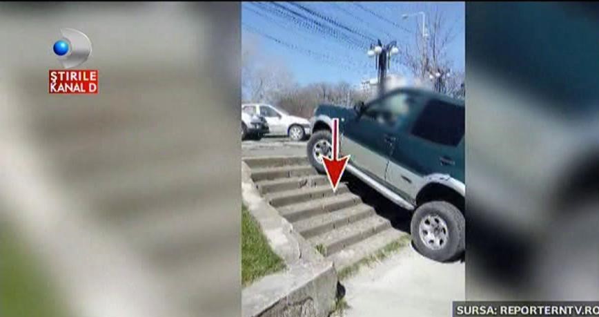 Imaginile cu soferul care a escaladat scarile cu masina, au ajuns....direct pe biroul politistilor! Aroganta l-a costat pe individ un dosar penal.