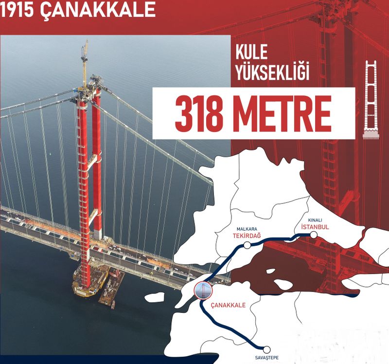 Podul Canakkale 1915, lung de 4,6 km şi cu o distanţă de 2 km între cei doi piloni, este primul care se întinde peste această strâmtoare de circa 60 de km care leagă Marea Egee de Marea Marmara.