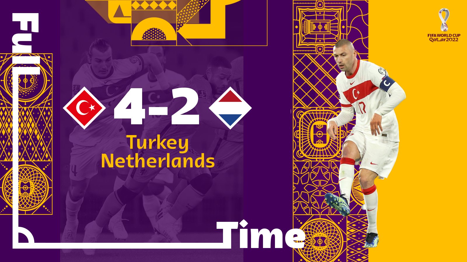 Pentru turci, Yilmaz a reușit un hatrick (trei goluri în minutele 15', 34', 81') și a înscris și Calhanoglu (46'), iar olandezii au avut o zvâcnire spre finalul partidei înscriind prin Klaassen (75') și de Jong (76'). Olanda a ratat și un penalty în minutul 90+5.
